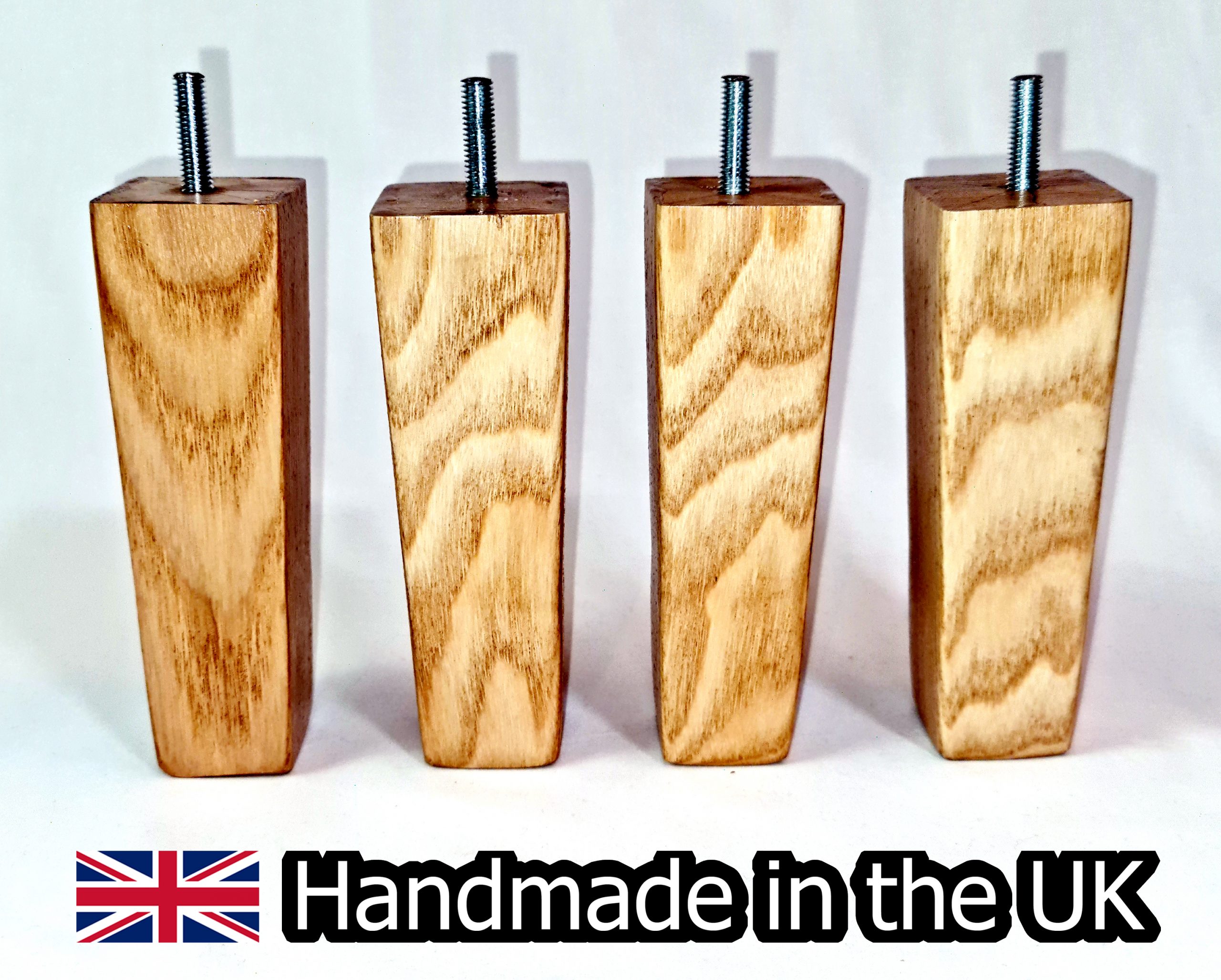 A set of four handmade, 15cm tall, solid wood (American Ash) furniture legs, with M8 screw thread. Supplied with T-Nuts for fixing, and optional washers. Supplied with furniture glides.