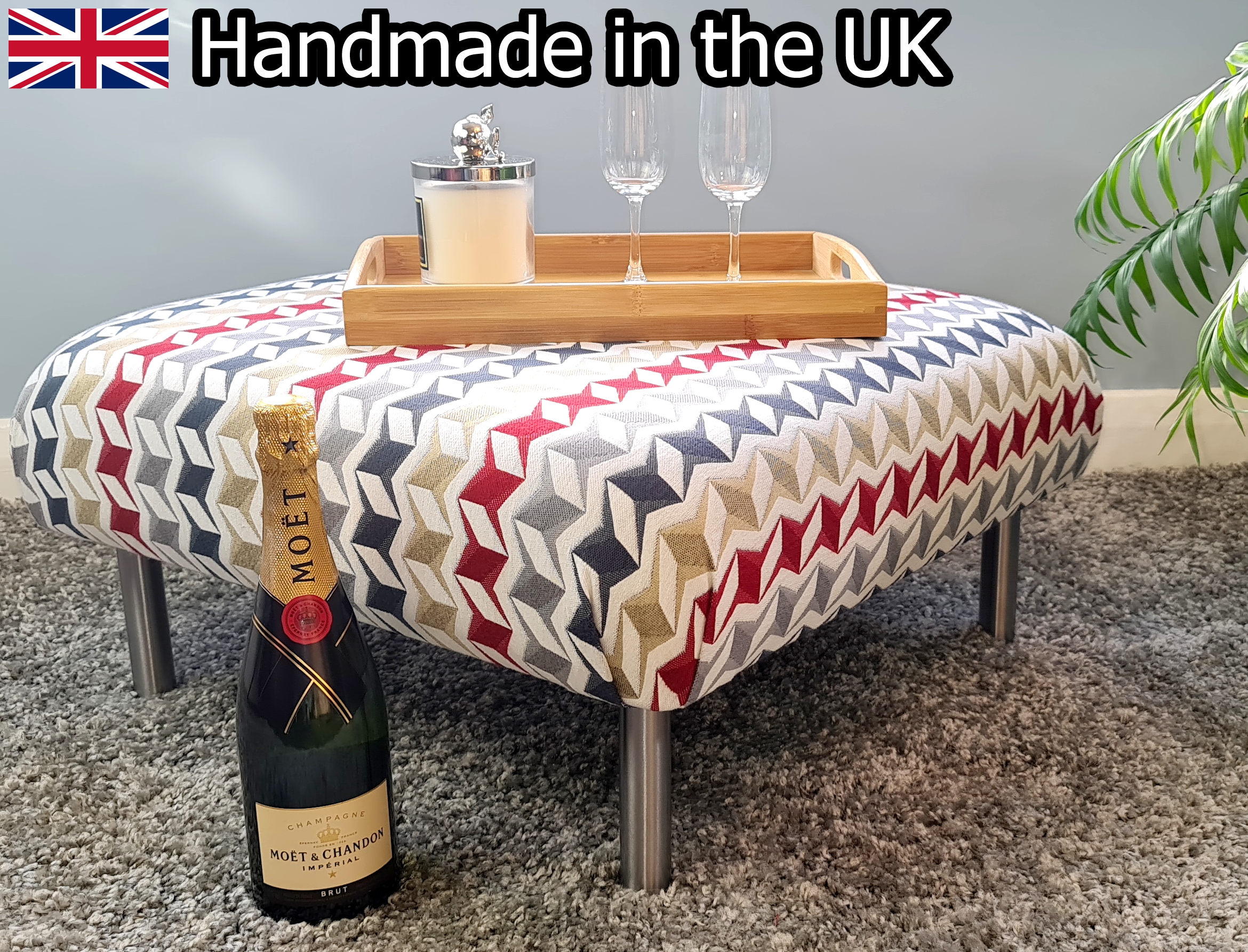 Handmade upholstered coffee table footstool – Large. Deep luxury cushion, upholstered with an elegant woven geometric fabric, strong 18mm plywood base fitted with tubular brushed steel legs, finished with rubber feet.